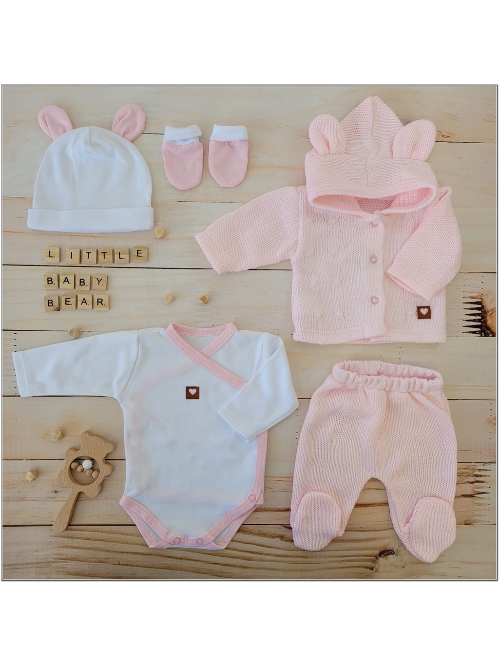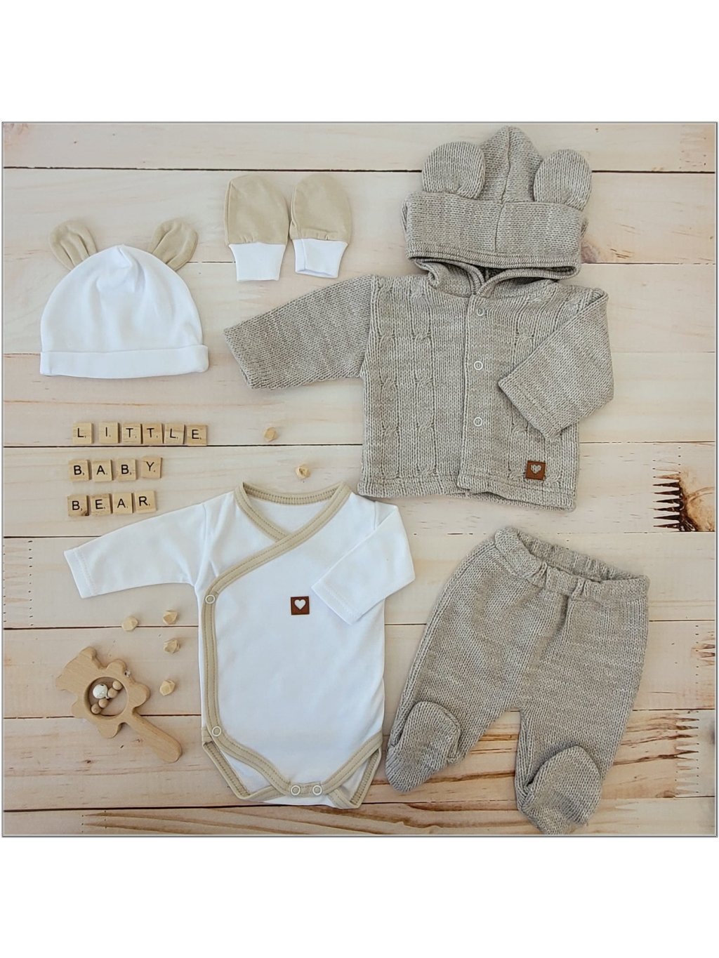 V setu najdete: • béžovou pletenou mikinku s kapucí a oušky, • béžové pletené polodupačky, • bílo-béžové body zavinovací na celé délce, • čepičku s oušky, • ochranné rukavičky .