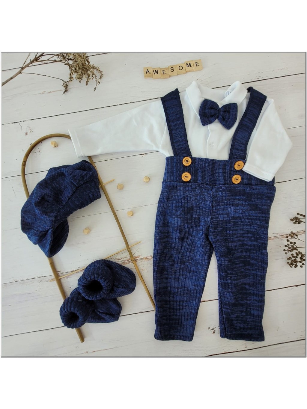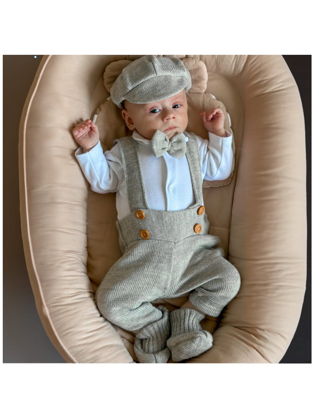 Z malého chlapečka udělá opravdového gentlemana! Tento 5 dílný komplet obsahuje bílé body s límečkem, kalhoty se šlemi, kabátek, čepičku a stylový .