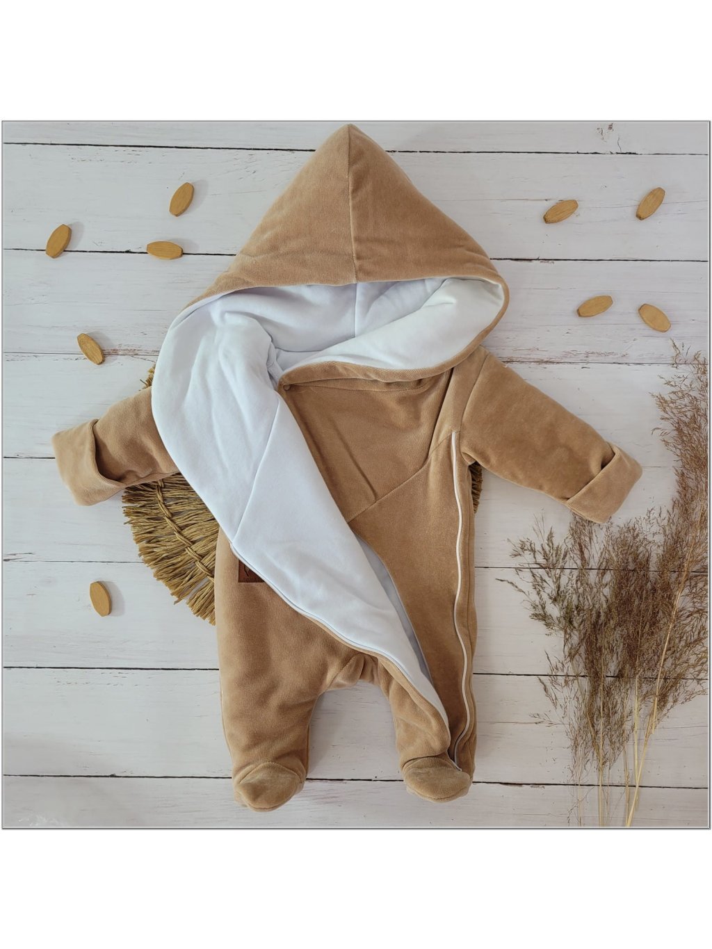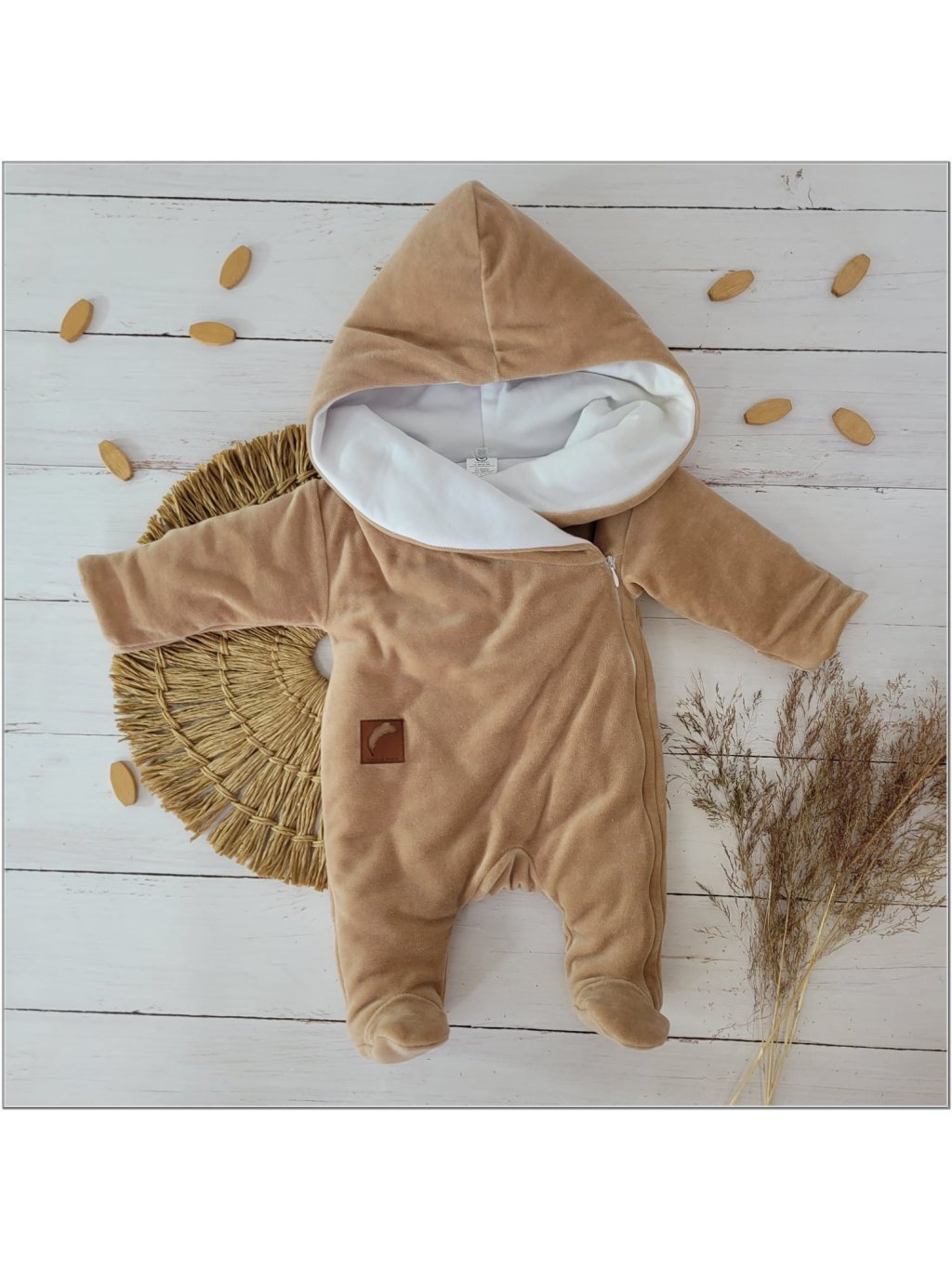 Stylový a hřejivý kousek pro první zimní procházky vašeho miminka. Tento luxusní overal je vyrobený z kvalitního veluru s vysokým podílem bavlny, podšitý 100% bavlněnou podšívkou a zateplený výplní mezi vrstvami – ideální do chladného počasí.